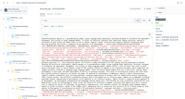 Execution Timeline: Complete workflow from query to response Performance Metrics: Timing for each operation step Document Processing: How documents are loaded and indexed Search Operations: Vector similarity searches and retrieval LLM Interactions: Calls to language models for response generation Error Tracking: Any failures or exceptions in the pipeline